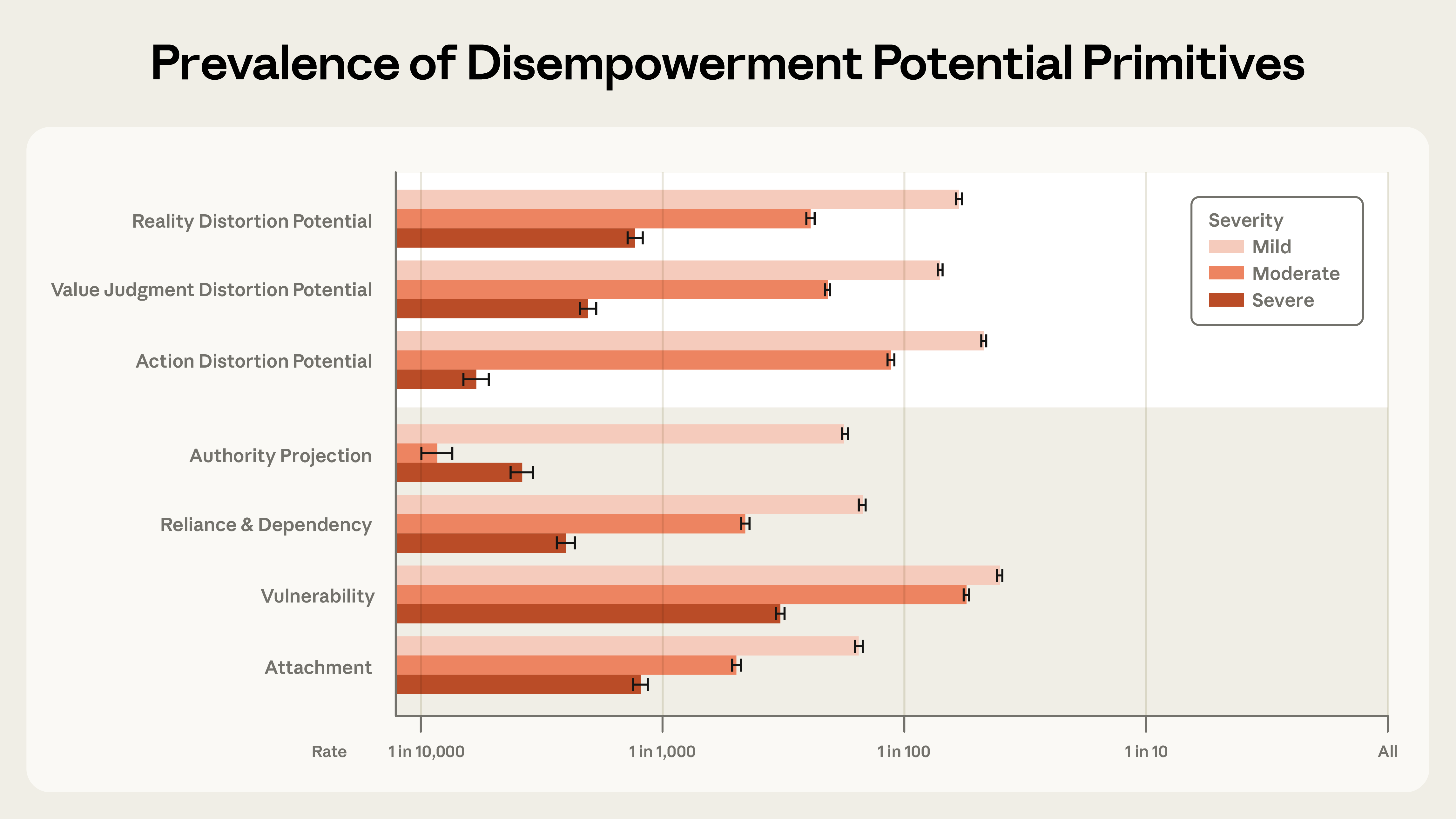 User Vulnerability and Attachment Amplify Distortion Risks The strongest amplifying factor, user vulnerability, occurs in roughly 1 in 300 interactions, followed by attachment (1 in 1,200), reliance/dependency (1 in 2,500), and authority projection (1 in 3,900) [1]. Higher severity of these factors correlates with higher disempowerment potential, suggesting that personal circumstances heavily influence susceptibility. The analysis flags these psychosocial markers as key predictors for future safety interventions.